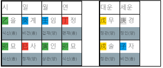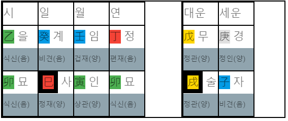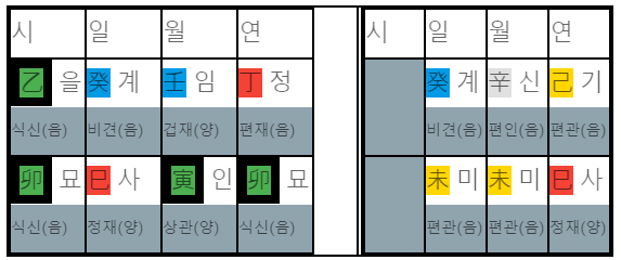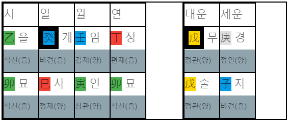 계사일주 남자와 계미일주 여자 사주를 2020년도 기준으로 둘 사이의 궁합을 보겠습니다.